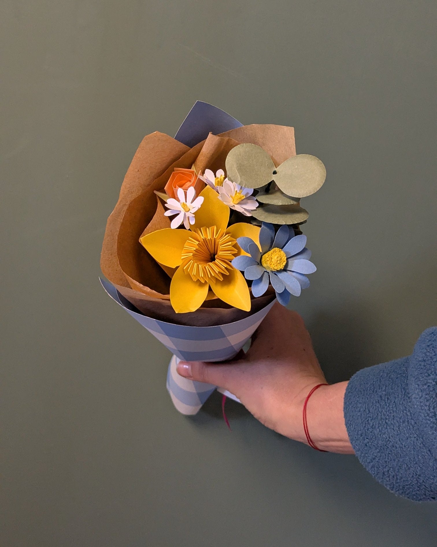 Blombukett av papper, handgjord med origami- och pappersklippstekniker från fin kartong.
